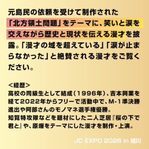 さらに!14時10分~ 北海道出身のお笑いコンビ、実力派漫才に加え近年は北方領土問題といった歴史、社会をテーマにした魂の漫才で全国を回わるアップダウンによる北方領土の歴史、想いを漫才を通して学んでいただきます!