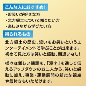 さらに!14時10分~ 北海道出身のお笑いコンビ、実力派漫才に加え近年は北方領土問題といった歴史、社会をテーマにした魂の漫才で全国を回わるアップダウンによる北方領土の歴史、想いを漫才を通して学んでいただきます!