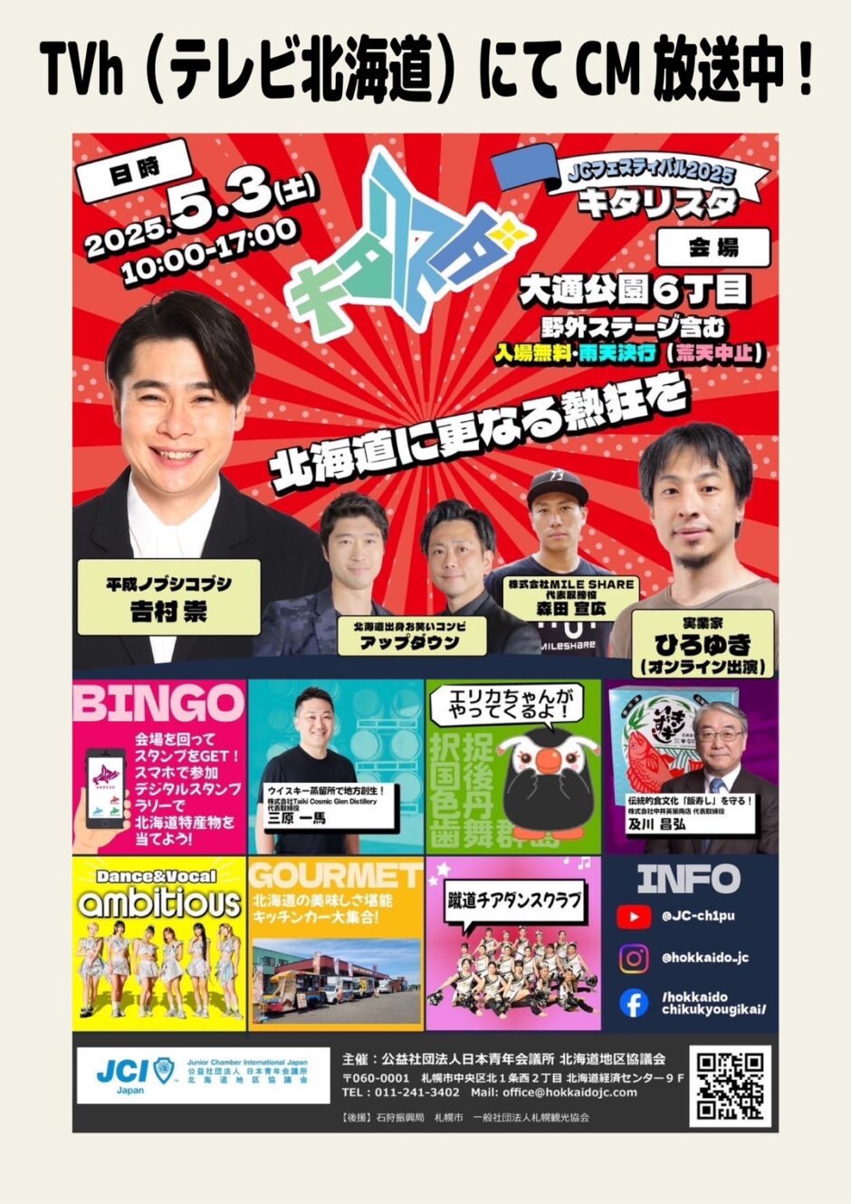 JCフェスティバル2025 キタリスタの概要が、テレビ北海道(TVh)にてCMおよび番組内で放送されます。イベントの魅力や注目ポイントを多くの方に知っていただける貴重な機会となりますので、ぜひご覧ください。