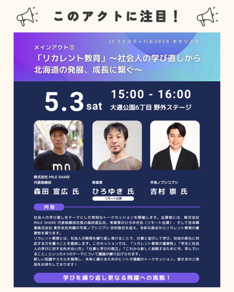 当日は、芸人・吉村崇氏(札幌出身)、森田宣広氏(MILE SHARE代表)との「リカレント教育」トークセッション内での出演を予定しています。